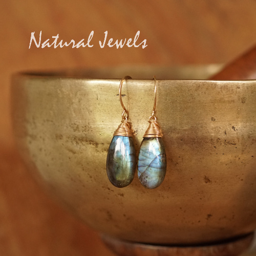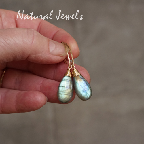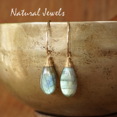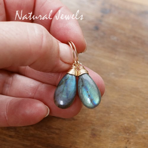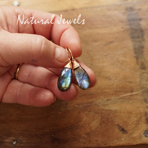 Oorbellen van 14K Goldfill met een briolet van Labradoriet. De stenen hebben de zo gewilde glad geslepen iets platte druppelvorm. De glans van dit paar is niet in één woord te vangen, ik zie veel kleurtjes maar het grootste gedeelte is toch wel blauw. Verder goudgeel en goudoranje en ik zie vleugjes groen en heel vaag iets wat richting lila gaat. De stenen hebben dunne zwarte lijntjes over het oppervlak lopen en ik zie hele kleine zwarte stippels in de ene en wat grote donkere stippen in de andere. Kortom: er is erg veel te zien in deze prachtige Labradoriet brioletten, het is een levendig paar met een sterke glans.