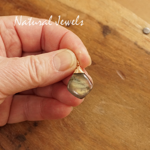 Een hangertje van 14K Goldfill met een briolet van Labradoriet. En dit steentje is verlegen, ze laat haar glans echt niet onmiddellijk zien, je moet er een beetje naar zoeken. Laat het licht spelen met deze Labradoriet en dan zie je wat bijzonders: een glans in oudroze-achtig-oranje-met een vleugje olijfgroen. Jaja. Het is zo lastig onder woorden te brengen. In ieder geval: ze zal niet teleurstellen. Tip: kijk er in de bovenkant in, daar verbergt ze al haar moois.