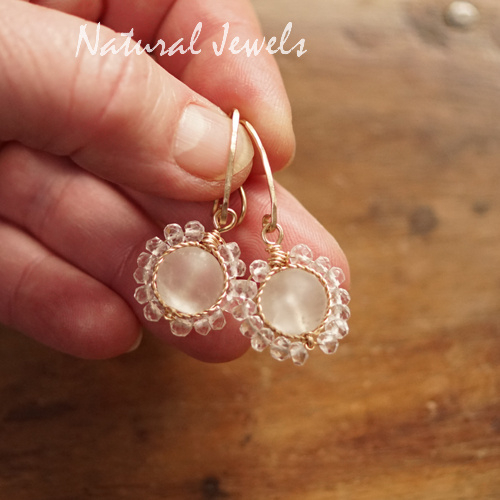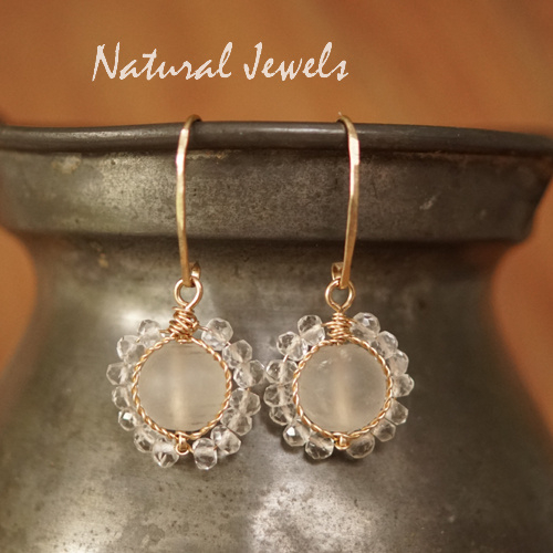 Handgemaakte oorbellen van 14K Goldfill met Bergkristal. In deze oorbellen zou je een bloemetje kunnen zien en dat komt omdat de Bergkristal in het midden rond is. Deze steen is glad geslepen en mat gepolijst. Rondom heb ik een koordje van goud geplaatst met daarachter facetgeslepen heldere rondelletjes van Bergkristal. Door de kleur zijn dit vrij neutrale oorbellen die je overal mee kunt combineren, maar de uitstraling is toch echt niet neutraal, voor wie van anders dan anders houdt.
