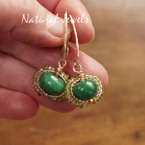 Handgemaakte oorbellen van 14K Goldfill met Serpentijn en Peridot. In het midden zie je een gladgeslepen rondel van Serpentijn in een donkergroene tint. Om de steen heen heb ik een koordje van goud gemaakt en daarachter zit een rij facetgeslepen rondelletjes van Peridot. Alles bij elkaar zijn dit absolute eye-catchers, heerlijk anders dan anders en gewoon ontzettend mooi.
