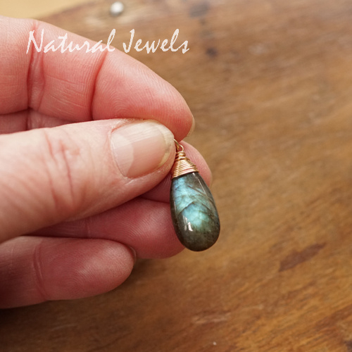 Een hangertje van 14K Goldfill met een briolet van Labradoriet in de vorm van een afgeplatte druppel. De briolet is gladgeslepen. Ze laat haar glans niet heel snel zien, maar als je hem eenmaal hebt gevangen is hij helder aanwezig in een prachtige iets donkere blauwgroene tint. Er lopen wat lijntjes over het oppervlak. De steen heeft een mysterieuze uitstraling, erg mooi, en als je er van de onderkant af inkijkt, zie je schitteringen in de steen. Geen idee wat dat is.