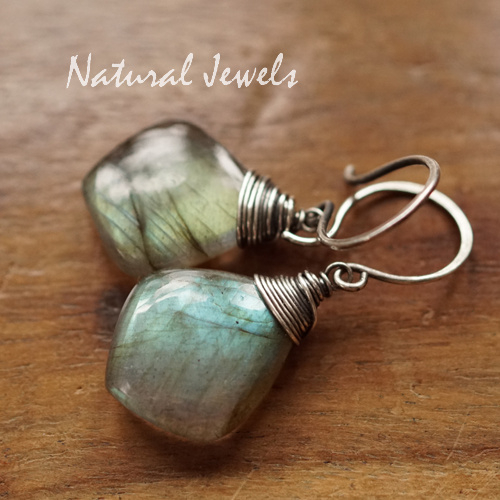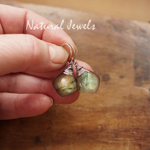 Oorbellen van Sterling zilver met een briolet van Labradoriet. De vorm noem ik bladvorm, je kunt er een blaadje in zien. De brioletten zijn gladgeslepen. De kleur van de glans is niet makkelijk te benoemen, bij een bepaalde lichtinval komen ze heel dicht bij elkaar, van dat lichte groenblauw, maar als je ze beweegt, gaat de ene meer naar blauwig toe, of eigenlijk meer blauwgroen. De andere heeft een verloop naar licht oranje. Hoe dan ook, ze zijn erg mooi en de glans is ook prachtig helder. De ene sten laat wat donkere lijntjes zien.