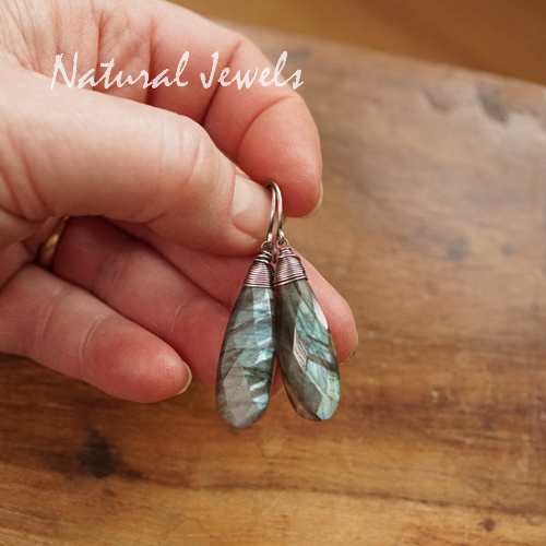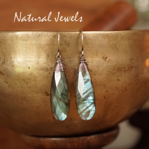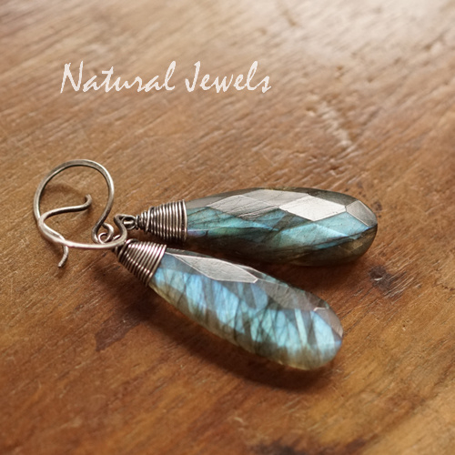 Sterling Zilveren oorbellen met wat grotere lange slanke facetgeslepen brioletten van Labradoriet van hoge kwaliteit. Het zijn grote brioletten in een pegelachtige druppelvorm die wat is afgeplat. De kleur van de glans is blauwgroen, of groenblauw, net hoe je het wilt zien. De glans is helder en ik zie diagonale banen over het oppervlak lopen, bij de ene meer dan bij de andere. Prachtige sierlijke en wat grotere Labradoriet oorbellen.