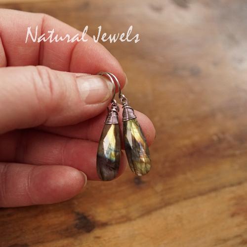 Oorbellen van geoxideerd Sterling zilver met een slanke facetgeslepen briolet van Labradoriet. De brioletten zijn in een pegelachtige druppelvorm geslepen die wat is afgeplat. Ik zie allemaal verschillende kleuren in de glans, de ondergroen is groen en er zijn vegen zichtbaar van andere kleuren. Ook laat de ene steen een vrij brede baan heel donkerblauw, misschien wel zwart, zien. Dit zijn hele levendige Labradoriet oorbellen.