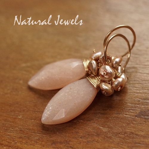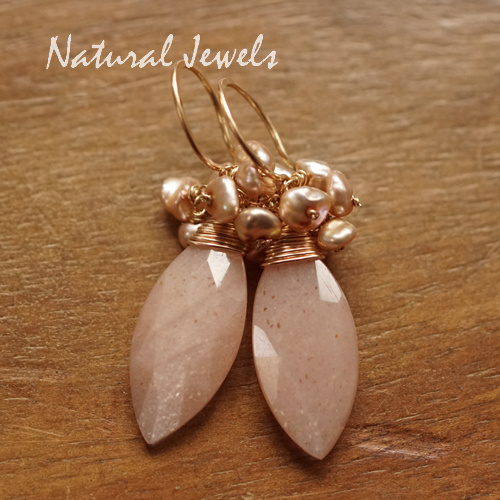 Oorbellen van 14K Goldfill met een briolet van Maansteen en Heishi zoetwaterpareltjes. De stenen zijn facetgeslepen en de Maansteen is een wat lichte tint in zalm, maar wordt perzikkleurig genoemd. Vreemd eigenlijk, ik heb nog nooit perziken in deze kleur gezien, maar wat maakt het uit, de stenen zijn erg mooi. Dit paar laat bij de juiste lichtinval een speelse lichte shimmer zien, heel bijzonder. De Zoetwaterparels die erboven in een cluster op handgemaakte pinnetjes zijn gezet, hebben allemaal een andere vorm en passen erg mooi bij de zachte zalmtint. De oorhaken zijn rond, maar je kunt ook kiezen voor andere oorhaken of oorstekers.
