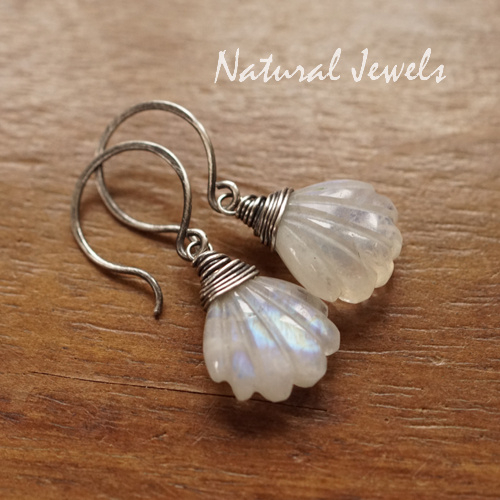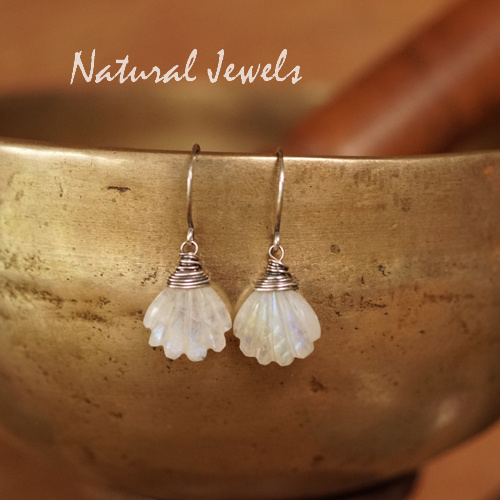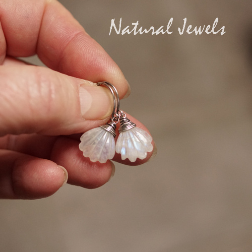Zilveren oorbellen met brioletten van Maansteen. Deze oorbelletjes zijn vrij klein, met de ronde oorhaken in totaal 2,9 cm. De brioletjes zijn geslepen in de vorm van een soort klokjesbloemetje, heel schattig. De glans van dit paar is voornamelijk blauw en deze glans laat zich in fragmentjes zien, je moet er een beetje naar zoeken. De stenen zijn niet exact gelijk van grootte, maar met een gezicht ertussen valt dat absoluut niet op.