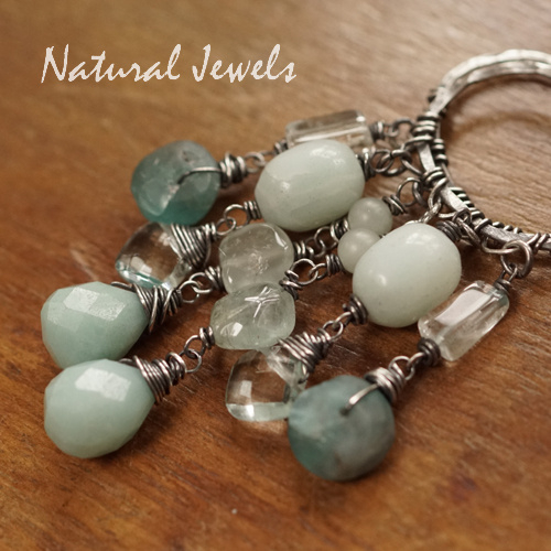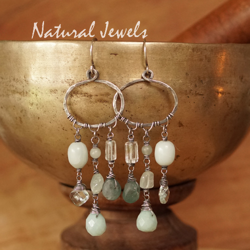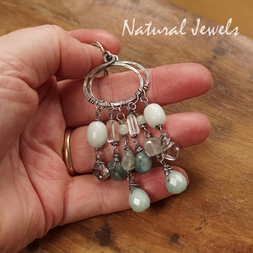 Oorbellen, geheel met de hand gemaakt, van Sterling zilver met edelstenen in lichtblauwe tintjes. De ovale vorm is gehamerd, je kunt de hamerslagen zien, zodat het geoxideerde zilver er mooi doorleefd uitziet. De verschillende stenen in verschillende vormen en kleuren zijn zorgvuldig bij elkaar gezocht en er is een harmonieus geheel ontstaan. De gebruikte edelstenen zijn: Amazoniet, lichtblauw gebeitste Kwarts, Apatiet en Aquararijn. Prachtige zilveren puur natuur oorbellen die niet onopgemerkt zullen blijven.
