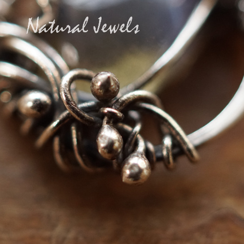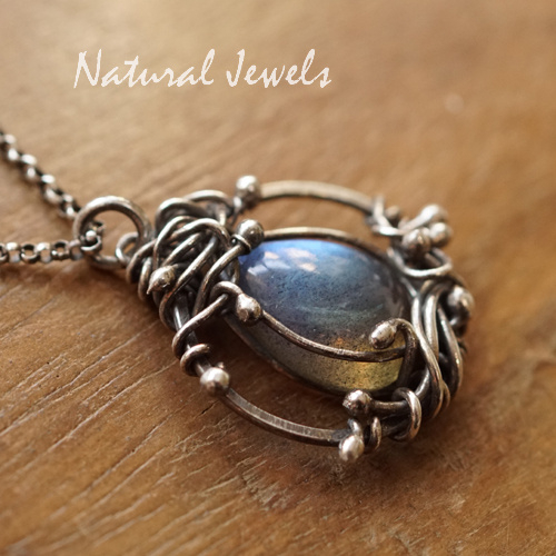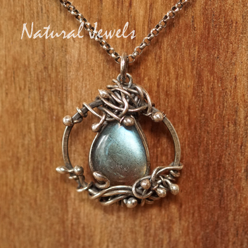 Een handgemaakte hanger van Sterling en Fijnzilver met Labradoriet. Het steentje heeft een prachtige zachtblauwe glans die zeer helder aanwezig is. Ze is omkaderd met zilveren ranken waarbij ik boven en onder de Labradoriet een zilverwerkje heb gemaakt van in elkaar gegroeide vloeiend verlopende takjes met kleine zilveren bloemenknopjes. Een absoluut uniek hangertje met een vriendelijke puur natuur uitstraling.