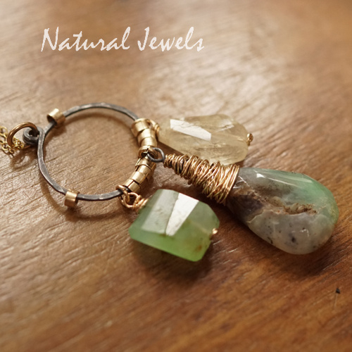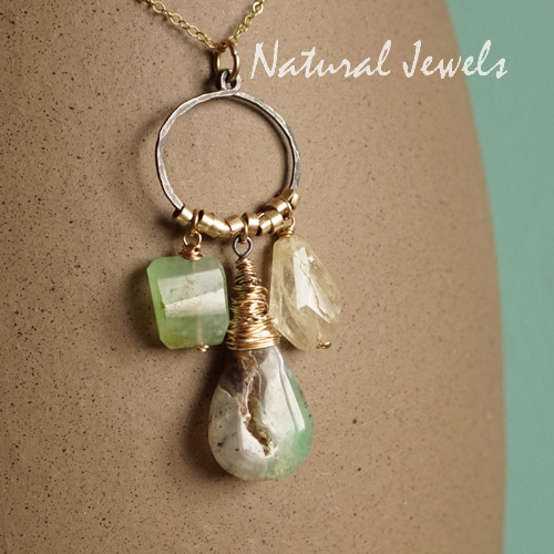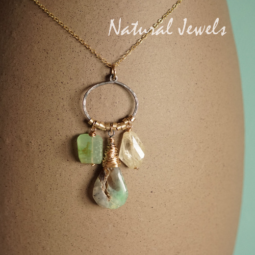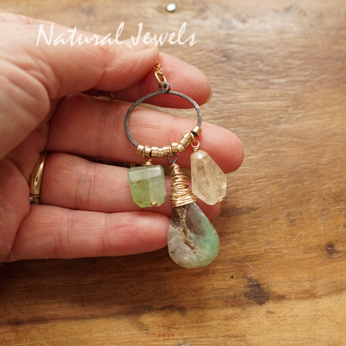 Een hanger van 14K Goldfill met een 3 verschillende edelstenen aan een liggende ovale vorm. De ovaal is van zwaar geoxideerd Sterling zilver, de hamerslagen zijn erin zichtbaar. Aan de ovaal hangen drie edelstenen, links een Prehniet, deze steen is in horizontale facetten geslepen. Rechts zie je een Bergkristal, ook deze steen is facetgeslepen. In het midden een Chrysopraas met een gouden coconsetting. Zoals je op één van de foto's kunt zien, heeft deze steen een natuurlijk doorkijkje, prachtig die zuivere uitstraling. Heel mooi vind ik hoe deze steen de kleuren van de andere twee in zich verbindt. De stenen worden uit elkaar gehouden door handgemaakte Goldfilled spacertjes. Het contrast tussen het zwarte zilver en het warme goud is boeiend. Een puur natuur hanger.