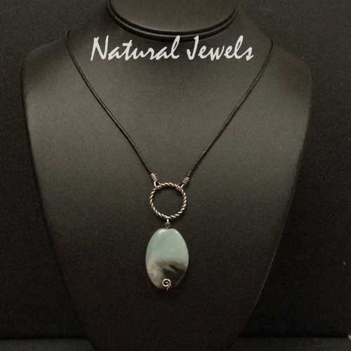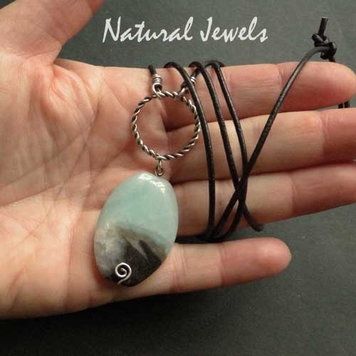 A necklace with an oval of Amazonite on a cord of leather.