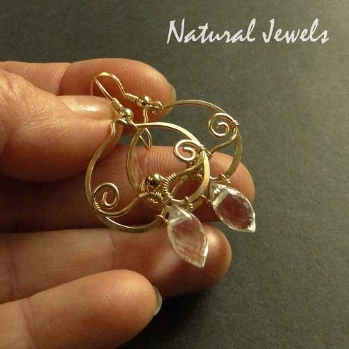 Deze oorbellen zijn met de hand gemaakt van draad van 14K Goldfill. De briolet heeft de rice-vorm en is van Bergkristal.