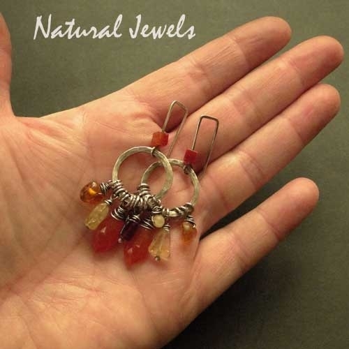 The briolette in Marquis shape is Carnelian and so is the square on the hook. Beads of Amber, Citrine and yellow Jade are alle hanging from the handmade circle of Silver.