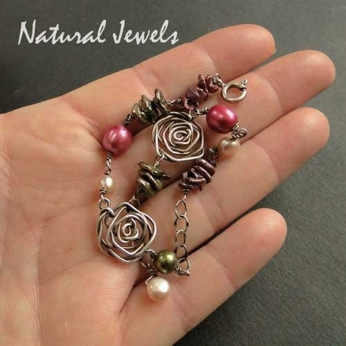 Two roses, made of Sterling silver wire, adorne this bracelet with freshwaterpearls in different shapes and colours.