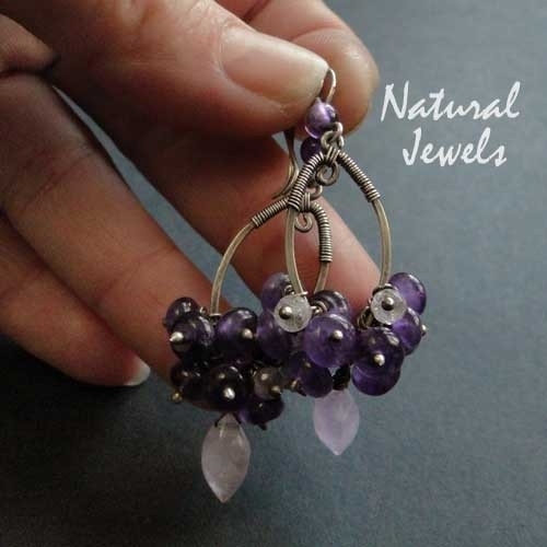 Rondellen van een donkere Amethyst, facetgeslepen rondellen van een veel lichtere kleur en een rice facetgeslepen briolet van Lavendel-Amethyst. Alles hangt aan een frame van Sterling zilver. Er is een piepklein Spiraaltje, er is wrapwerk, handgemaakte pinnetjes, verschillende vormen en verschillende tinten paars, alles bij elkaar vormt het een mooie harmonie.