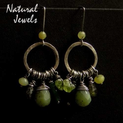 Earrings totally handcrafted from Sterling and Fine silver and gemstones in green shades.