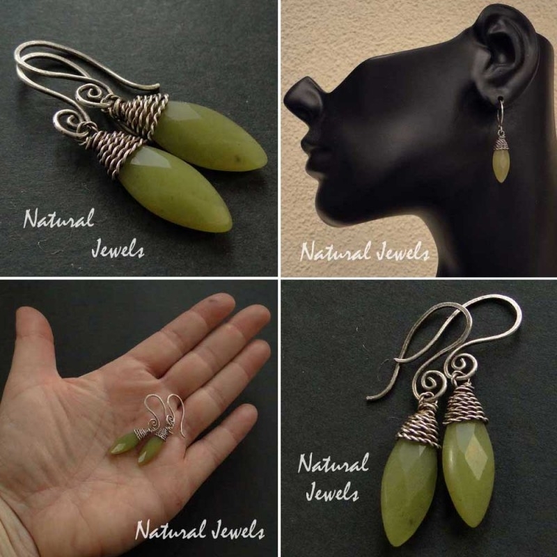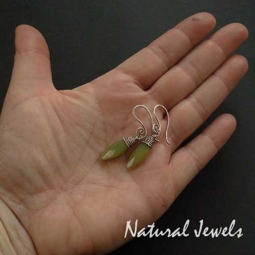 Oorbellen van 925 Sterling zilver met een facetgeslepen briolet van olijfkleurige Jade.