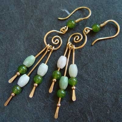 Oorbellen van 14K Goldfilled draad. De spiraal is het symbool van de Eeuwigheid maar het is natuurlijk ook gewoon een heel sierlijk en elegant ornament. Aan de pinnen hangt een heel klein kraaltje van 14K Goldfill, een ronde kraal van Groene Granaat en een ovaaltje van Nieuwe Jade. Een hele mooie combinatie.