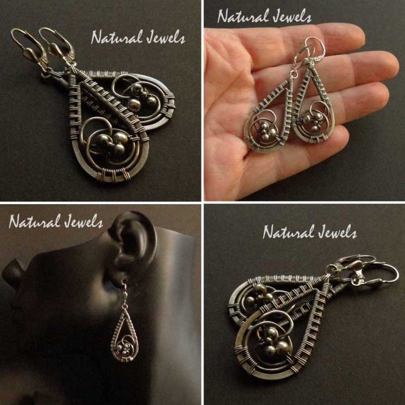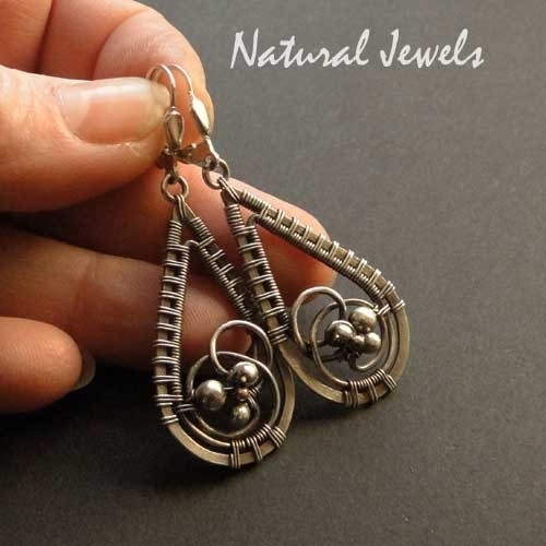 Oorbellen van Sterling en Fijn zilver in druppelvorm. Wrapwerk in combinatie met free-flow silver en een bundeltje zilveren kraaltjes in het midden. Veilige Klaphaken.