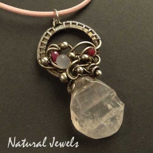 Een halsketting met een ruwe briolet van Rozenkwarts en een handgemaakt ornament van Sterling en Fijn zilver in de Free-flow-style. Veel zilveren kraaltjes, 2 kraaltjes van de edelsteen Robijn en een facetgeslepen brioletje van Chalcedoon zijn verwerkt in het zilverwerk. Er is een balans tussen de sierlijke lijnen van het zilverwerk en het ruwe van het Rozenkwarts. De hanger is bevestigd aan een koord van leer ineen zacht-roze tint.