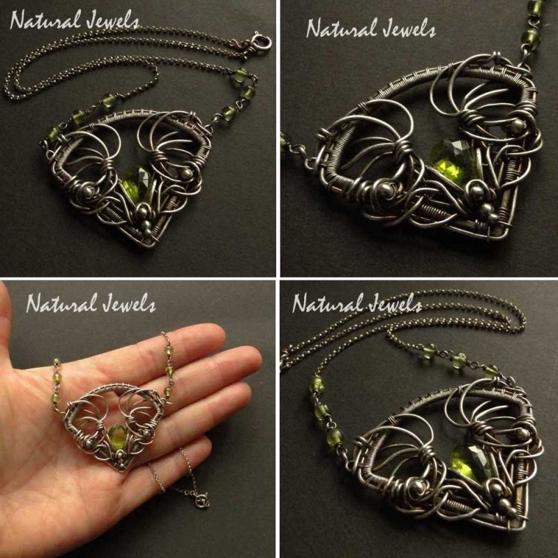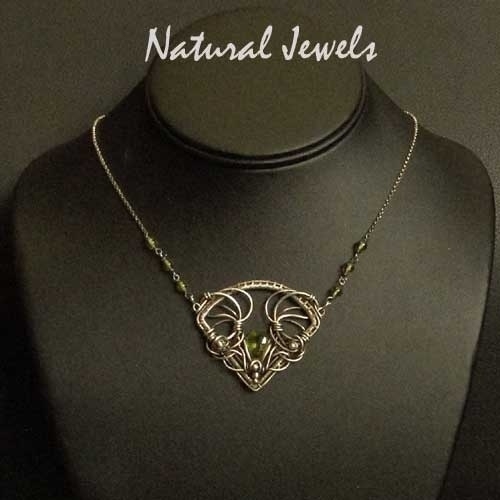 Handmade necklace with a briolette and round beads of the beautiful brightgreen gemstone Peridot. The pendant is 5 cm wide and 4 cm high, the necklace chains are 40 cm long.