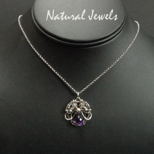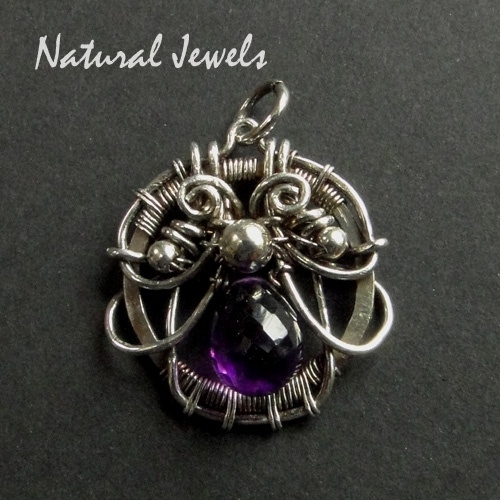 A small pendant, made by hand of Sterling and Fine silver wire. The gemstone is Amthyst, and the briolette is very clear and beautifully facetted.