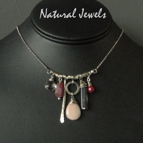 Een halsketting met in het midden een prachtige gladgepolijste briolet in druppelvorm van roze Opaal. De briolet hangt aan een handgehamerde cirkel van zilver. Helemaal links een gefacetteerde briolet van Mystic Pink Quartz, daarnaast een ruwe brok Robijn en rechts van de Opaal hangt een stick van Rutielquartz met daarnaast een prachtig facetgeslepen brioletje van Robijn. Een zachte en vrouwelijke halsketting met een hele stoere en krachtige uitstraling.