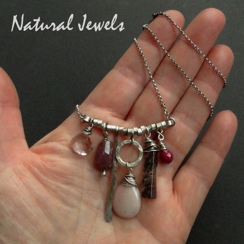 A necklace with in the middle a beautiful polished briolet of pink opal in the shape of a drop. The briolet hangs on a hand hammered circle of silver. On the far left there is a faceted briolet of Mystic Pink Quartz, next to this there is a rough chunk of Ruby and on the right of the Opal there is a stick of Rutielquartz and a beautiful faceted briolet of Ruby. A soft and feminine necklace with a very rough and powerful appearance.