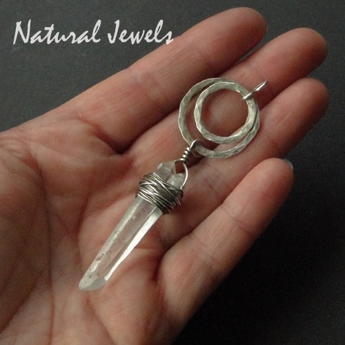 A pendant of sterling silver with a rough stick of rock crystal. You may think that this stick is crafted, but this is not the case: he has grown this way. If you look closely, you can see that the stick exist from 2 bars, with a little one that has grown against a large bar. It reminds me of a mother with a child. The stick is caught in a thin thread of silver and hangs on a silver hand hammered circle. Simple and pure.