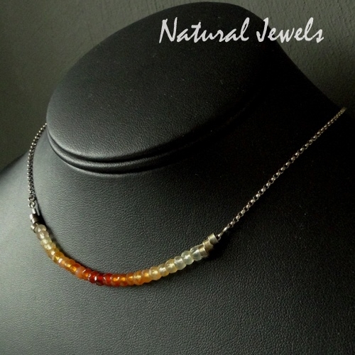 Een halsketting van Sterling zilver met facetgeslepen rondelletjes van Hessoniet in verlopende tinten. De rondelletjes zijn klein met een doorsnede van 3 millimeter en ze hebben allemaal superkleine facetjes. Erg mooie steentjes.