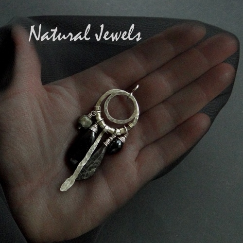 Een hanger met stenen in zwarte en grijze tinten. Al het zilver is Sterling en alle elementen zijn door mij met de hand gemaakt. De stenen zijn van links naar rechts: Pyriet, Onyx, Rutiel Quartz en nog een keer Onyx.