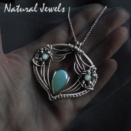 A pendant with graceful lines of silver with clear influences from the Jugendstil art. The pendant hangs on a silver chain of 40 cm long. The briolet is blue Chaldedoney, the blue round beads on both sides are Amazonite. It takes a lot of time to make pendants like this but I'm always really happy when I see what is slowly growing in my hands.
