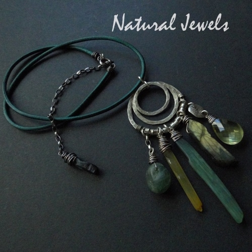 A beautiful sturdy pendant with exceptional gemstones. On the left there is a rough chunk of green Fluorite, a stick of Hematoid Orange Quartz, a stick of green Serpentine, a rough bar of Labradorite with a magical flash and a sparkling faceted briolette of Lemon Quartz. They fit beautifully together and hang on three hand-formed silver circles.