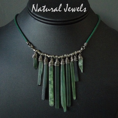 Beautiful sticks of Serpentine in various shades of green and dimensions and captured in silver wires, are hanging on this necklace. The middle part is made of silver, on both sides there is a cord of green leather. A beautiful natural and timeless beauty.