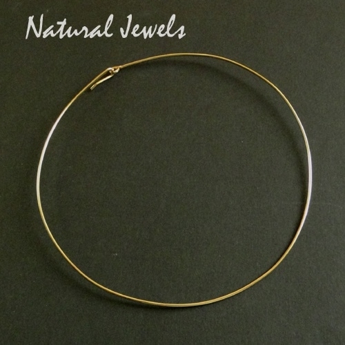 Een spang van draad van 14 karaat Goldfill. De sluiting is met een haak en over de haak kan de hanger geschoven worden.