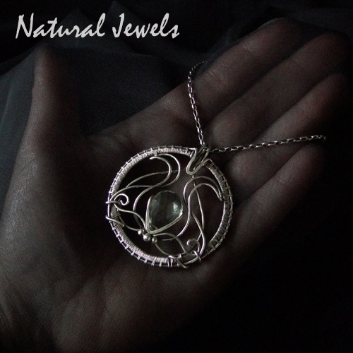 A handmade pendant of Sterling and Fine silver and a dazzling briolet of Green Amethyst. Beautifully transparent, without any inclusions and faceted in a way that ensures that the light is reflected so beautifully that it makes the briolet sparkle and shine.