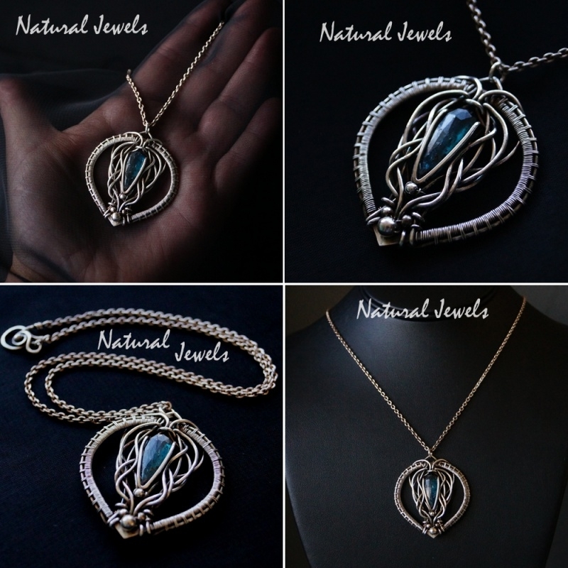 The stone in this handmade silver pendant is a very special one. It is the gemstone Moss Kyanite and the colour is very beautiful and hard to express in words. It is blue, but there is a grey and green shade in it and not untill the light is falling into the stone, you can see that it is actually Moss Kyanite. The difference with normal Kyanite is, that there are very small inclusions in the Moss Kyanite, that look like moss.
