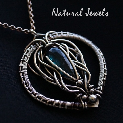 De steen in deze handgemaakte zilveren hanger is een hele bijzondere. Het is Moskyaniet en de kleur is heel erg mooi en lastig te benoemen. Blauw, maar met een grijze en groene zweem en pas als het licht erin valt, zie je dat het Moskyaniet is. Moskyaniet en geen gewoon Kyaniet, omdat er kleine insluitingen inzitten die een beetje lijken op hele kleine stukjes mos. Het zilverwerk aan beide zijden van de steen doet denken aan Keltisch knoop en vlechtwerk. De buitenste rand van de hanger is heel fijn zilver weefwerk.