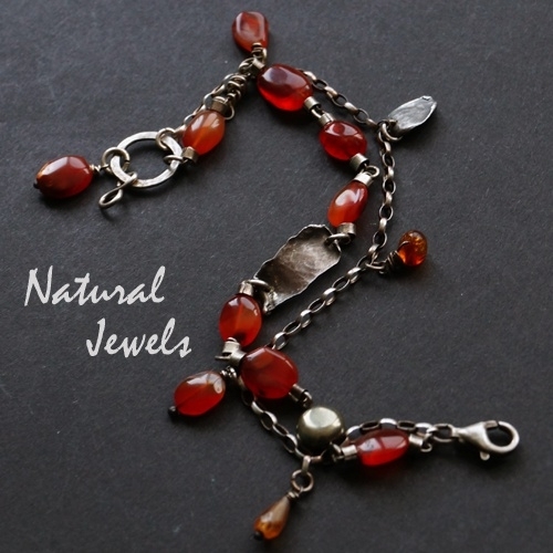 Een armband van Sterling zilver en oranje edelstenen. Bijna alles is Carneool, maar er zijn ook een brioletje van Hessoniet en een brokje Amber bij. Verder zilveren elementen die er prachtig doorleefd uitzien, doordat ze stevig onder handen zijn genomen. Het is altijd weer een verrassing om te zien wat het effekt is op het zilver.