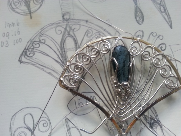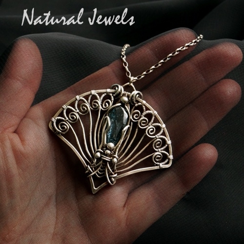 Er zit erg veel wrapwerk aan deze hanger die een beetje aan een pauwenstaart doet denken door de vorm van een waaier, met daarin aan de uiteinden ovale krullen. De steen is echter anders van kleur dan pauwenblauw, het is een moeilijk te benoemen kleur blauw, maar erg mooi.