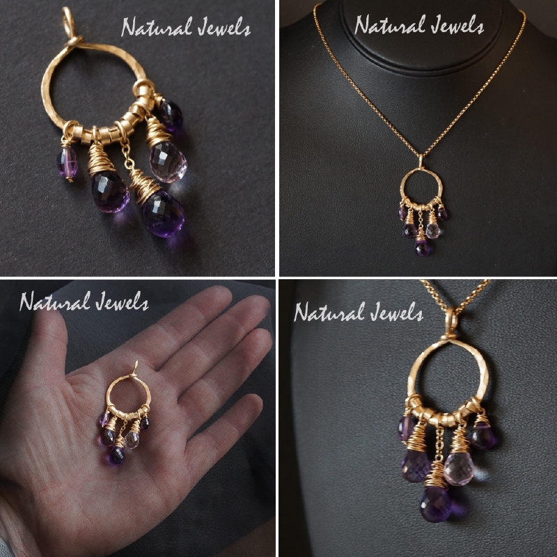 Een hanger van 14K Goldfill met brioletten van Ametist. De brioletten zitten gevangen in een coconnetje van gouddraad en hangen eensgezind aan een met de hand gehamerde cirkel. Alle elementen zijn van 14K Goldfill en zijn met de hand gemaakt.