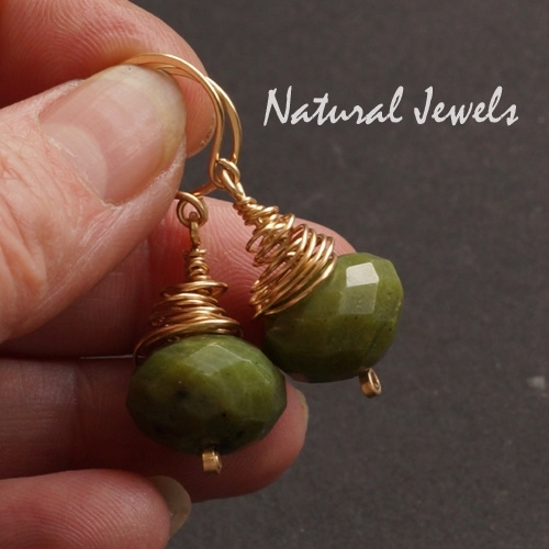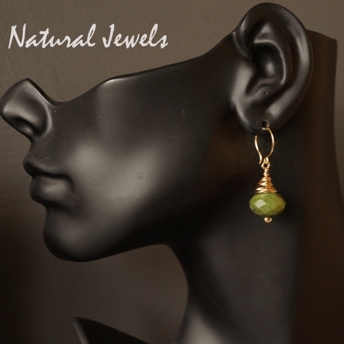 Een grote rondel van groene Jade, facetgeslepen met een cocon van gouddraad hangt aan een ronde oorhaak. Deze oorbellen zijn er ook met een veel kleinere rondel en van een iets lichtere kleur groene Jade.