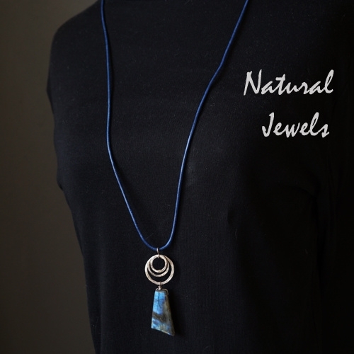 Een hanger van Sterling zilver met een prachtig stuk Labradoriet. De steen is glad gepolijst en vertoont die mooie flash die labradoriet zo bijzonder maakt. De cirkels zijn met de hand gehamerd en alles hangt aan een donkerblauw leren koord.