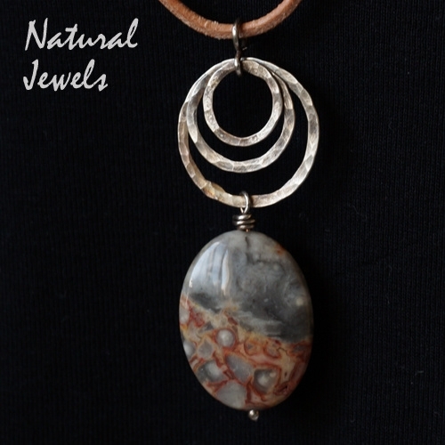 Crazy Lace Agaath, elke steen is weer totaal anders. Deze ovaal heeft veel grijs in zachte tonen, daarbij wat okergeel en kittige rode randjes. Een prachtige tekening op een gladgepolijste ovale steen. De steen hangt aan drie met de hand gehamerde cirkels van Sterling zilver aan een leren koord in een bijpassende kleur.