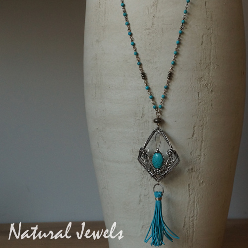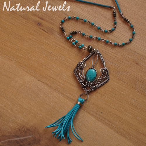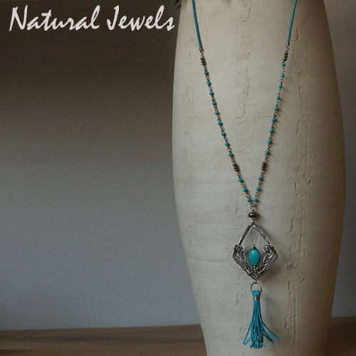 Een Boho halsketting van Sterling zilver, Turquoise, Pyriet en een lederen koord. De hanger is met de hand gemaakt uit draad van Sterling en Fijn zilver en combinatie met een ovale steen van Turquoise. De zilveren lijnen vormen een vlechtwerkje en zijn afgewerkt met zilveren kraaltjes. De steen is ovaal en glad gepolijst en is omkaderd door een zilveren koordje. Onder de hanger hangt een trendy kwastje, van leer in een passende tint. De hanger hangt aan een schakelketting met vlak boven de hanger een rondelle van Pyriet, daarboven schakels met een rond kraaltje van Turquoise, afgewisseld met schakels met kleine rondelles van Pyriet. Alle schakels zijn door mij met de hand gemaakt. Beetje overbodig te vermelden eigenlijk, want alles is met de hand door mij gemaakt ;-) De hanger is 6,1 cm hoog en 4,8 cm breed.