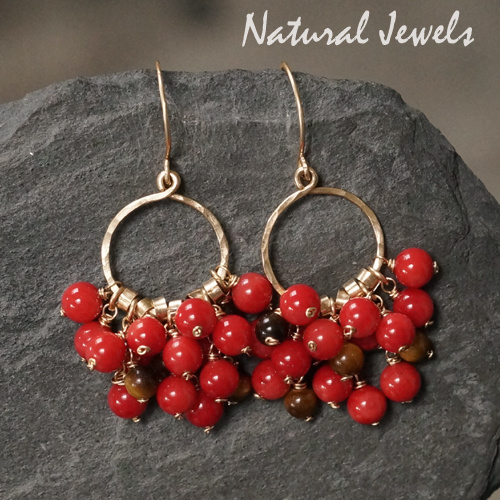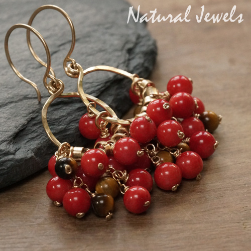 Een gehamerde ring van 14K Goldfill hangt aan een elegante ronde oorhaak. Aan elke oorbel hangen in totaal 14 kraaltjes van Rood Koraal en 4 kraaltjes van Tijgeroog aan kleine stukjes schakelketting. Ieder kraaltje is op een handgemaakt pinnetje gezet. Speelse oorbellen die gezien willen worden!