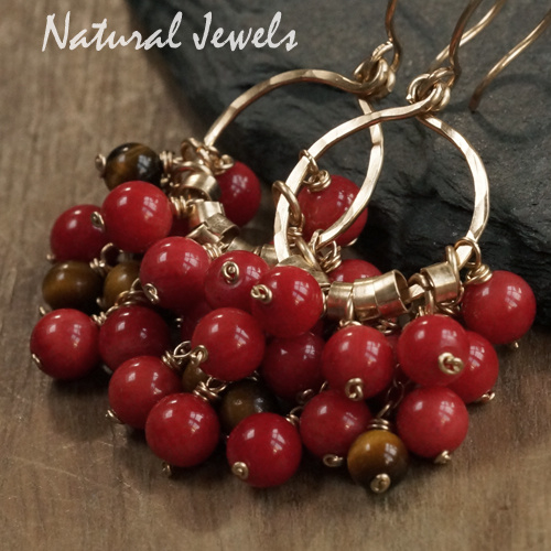 14K Goldfilled handgemaakte cluster oorbellen met Koraal en Tijgeroog.