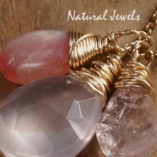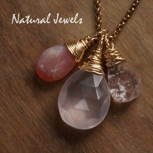 Een setje van 3 brioletjes in roze tintjes, gevat in 14K Goldfill. In het midden een facetgeslepen briolet van Rozenkwarts. Het gladde brioletje is Roze Opaal en het kleinste brioletje is weer een Rozenkwarts, maar een brioletje die aan de voor- en achterkant niet is geslepen. Heel puur en lief.