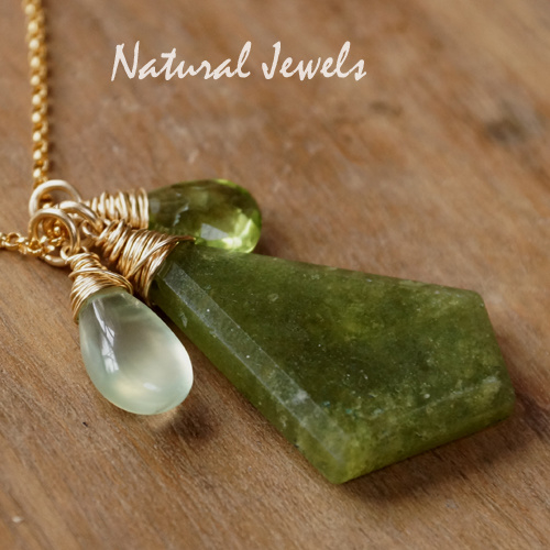 Een setje van 3 hangers in 14K Goldfill. De grootste hanger is een gladgeslepen vorm van de warm groene edelsteen Vessoniet. De steen is niet egaal van kleur, maar je ziet er wat insluitingen in, wat normaal is bij deze edelsteen en wat zorgt voor een levendig uiterlijk. Het matte gladgeslepen brioletje is Prehniet, heel licht en zachtgroen, melkachtig van transparantie. Het andere brioletje is facetgeslepen en is een Olivijn oftewel een Peridot. De Vessoniet is vrij groot, inclusief het ophangoogje komt de hanger op 4 cm.