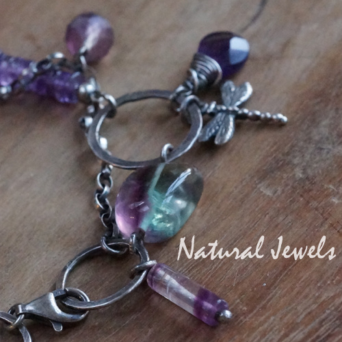 Een armband van Sterling zilver, met een streng discs van Ametist, gehamerde zilveren cirkels en een grotere nugget van Fluoriet. Deze steen is prachtig, beide kleuren van Fluoriet namelijk paars en groen, zijn te vinden in deze steen. Verder zijn alle andere kralen ook van Fluoriet, behalve het brioletje wat aan één van de cirkels hangt, dat is van Ametist. Aan dezelfde cirkel hangt een zilveren libelle. De armband sluit met een karabijnsluiting. Een prachtige armband met een zachte uitstraling.