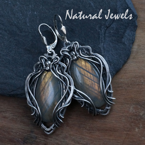 Met de hand gemaakte oorbellen van Sterling en Fijn zilver met een cabuchon van Labradoriet.